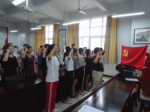 首先,进行新党员宣誓、老党员重温入党誓词。在鲜红的党旗下,由杜尉平副主任领誓,全体党员,面向党旗,举起右手、握紧拳头,庄严宣誓:“我志愿加入中国共产党,拥护党的纲领,遵守党的章程……”一句句铿锵有力的誓词,一声声笃信坚定的话语,坚定了新老党员对党绝对忠诚的政治信仰。