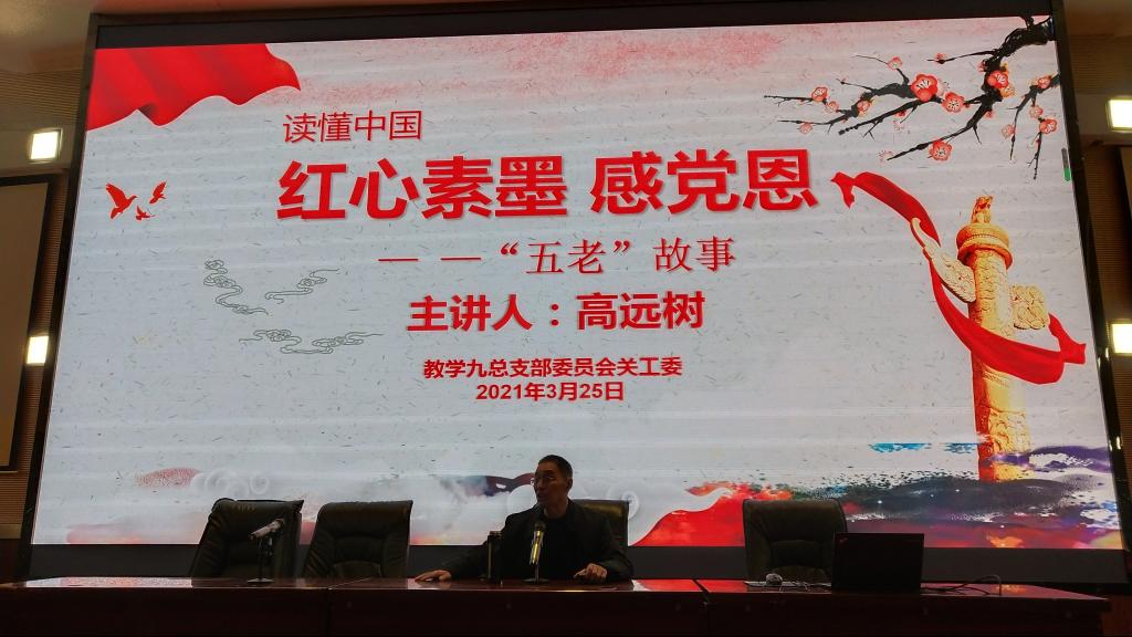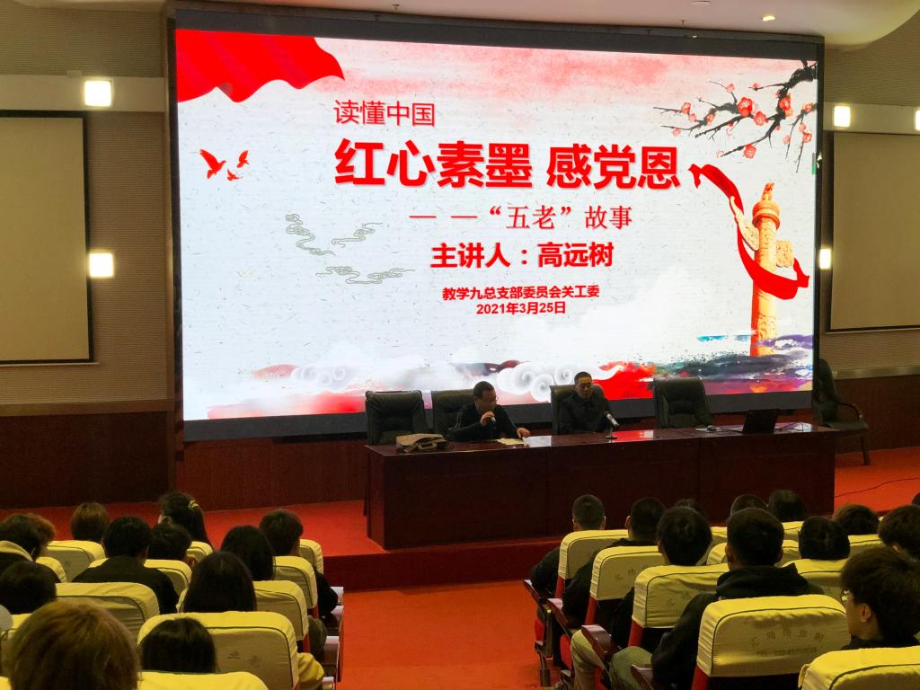 3月26日晚,教学九总支“红心素墨,感党恩”之“五老”讲故事活动在学术报告厅成功举办。本次活动根据学院关工委“读懂中国”的活动要求,紧密围绕“讲好入党故事,谢党恩”为主题,特邀原艺术系主任、四川省高校高级职称评审委员、中国书法家协会会员、遂宁市书法家协会副主席、国家级艺术骨干教师高远树教授担任主讲人。活动由教学九总支副书记漆波主持,艺术与设计系副主任杜玉平、党政办主任何意、团总支书记谢茜出席活动现场,总支青年教师及部分学生代表参与了本次活动。