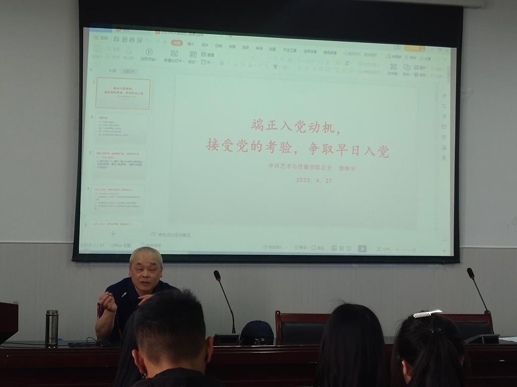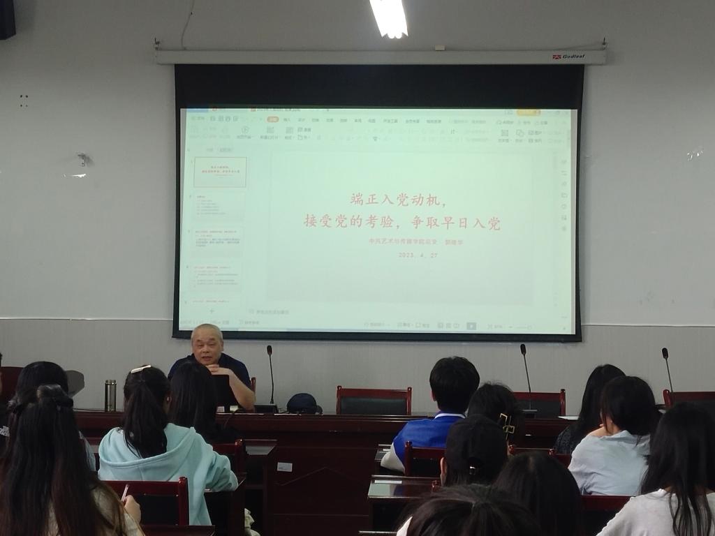 2023年4月27日下午在艺术与传媒学院会议室,我院党总支书记郭继华同志给四十余名入党积极分子上了一堂“端正入党动机,接受党的考验,争取早日入党”的党课。