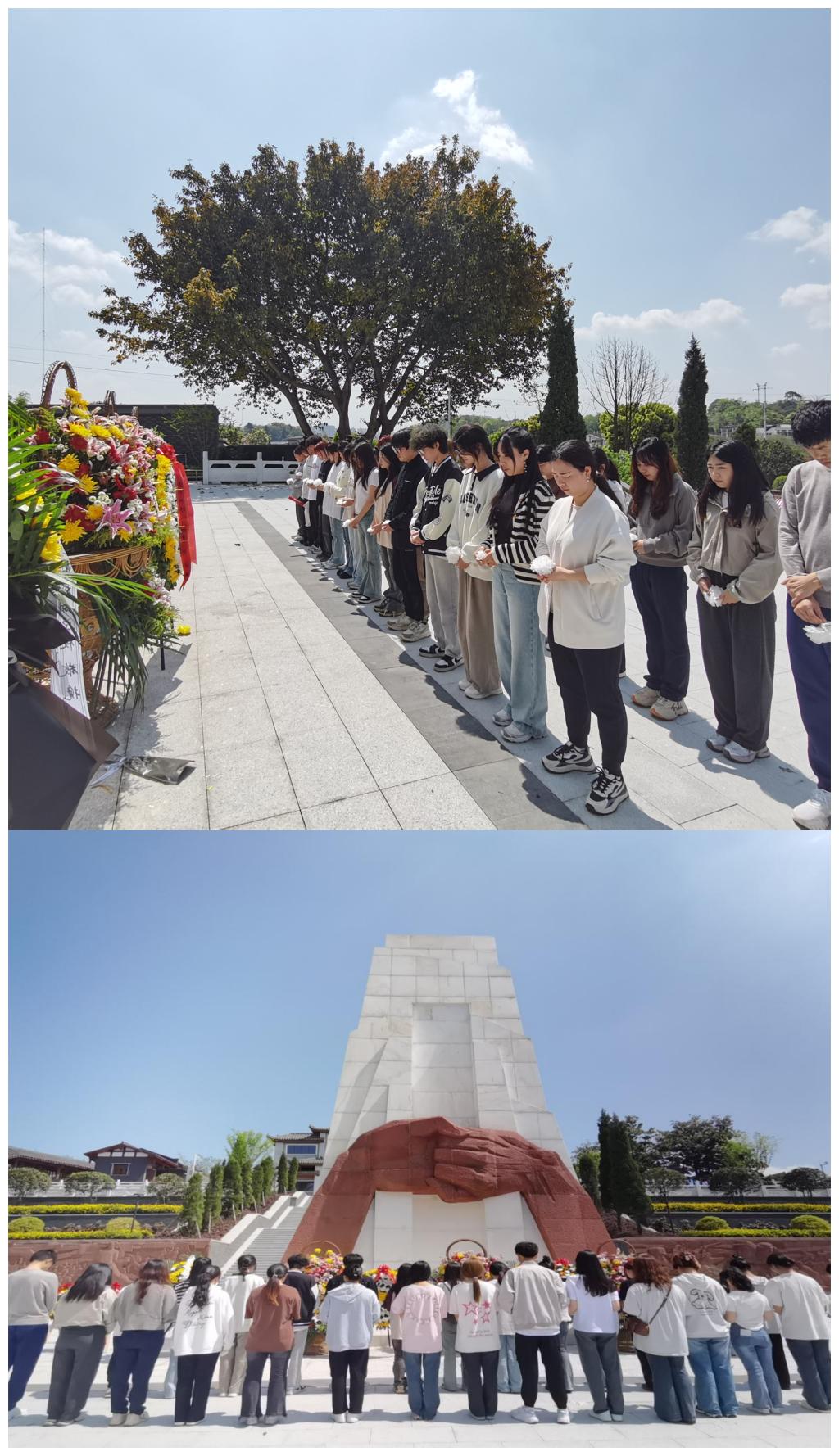 在烈士墓碑下,师生们默哀致敬,敬献百花,并怀着崇敬的心情依次瞻仰英雄纪念碑,追思革命先辈们的丰功伟绩,表达对革命先烈的深切缅怀之情。