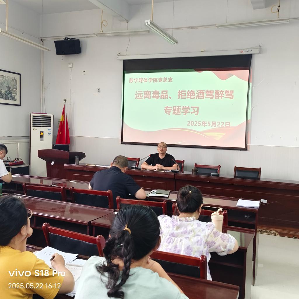 为深入贯彻落实全面从严治党要求,强化教职工法纪意识和责任担当,营造风清气正、安全和谐的校园环境,2025年5月22日,数字媒体学院党总支在博雅楼M408组织开展“拒绝酒驾醉驾,远离毒品危害”警示教育主题党日活动。学院全体教职工参加活动,活动由党总支书记陈俊杰主持。