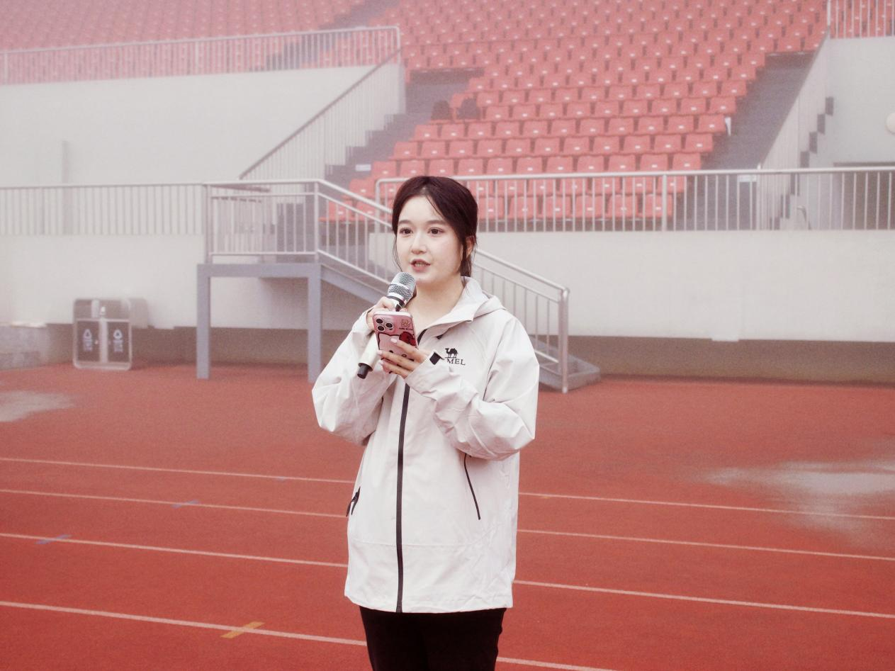 随后,学生代表2025级新闻专业李奕菲同学上台发言。她向全体同学发出倡议,号召大家珍惜学校提供的平台,积极投身晨跑活动,不仅跑出健康的身体,更跑出数字媒体学子朝气蓬勃、团结协作的精气神,用实际行动展现新时代大学生的青春风采。