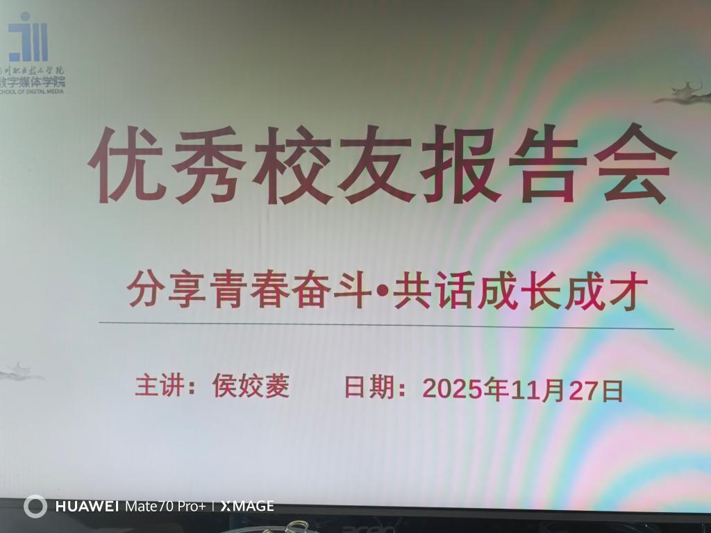 为搭建校友与在校学子的交流桥梁,破解数字媒体领域就业、创业困惑。11月27日,数字媒体学院在龙凤园区B5-308教室举办以“分享青春奋斗•共话成长成才”为主题的优秀校友返校报告会。邀请四川灵感广告传媒有限公司执行董事长侯姣菱校友返校,为70余名师生带来一场干货满满的成长分享。