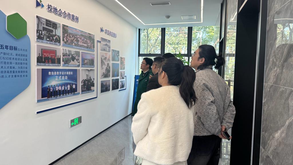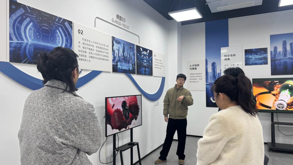 考察最后一站,团队来到威凤数字科技(四川)有限公司。作为西南裸眼3D技术领域的领军企业,该公司拥有西南首个裸眼3D产学研基地,在沉浸式光影艺术设计、3D立体影视成像技术等方面成果显著,且与多所高校建有稳定的校企合作关系。企业负责人带领考察组参观了裸眼3D技术创新中心,展示了AI算法驱动的立体转制技术、动态光场显示等前沿应用场景,并介绍了公司在产教融合、技能培训等方面的成熟经验。