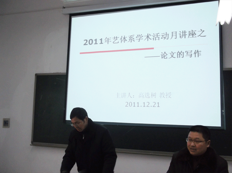 2011年12月21日下午,艺体系在学院第四教学楼106教室隆重举行学术月活动,邀请高选树教授作专题讲座。出席的领导有学院科研处漆明龙处长、艺体系郭登礼书记、颜晓辉副主任和艺体系全体教职员工。